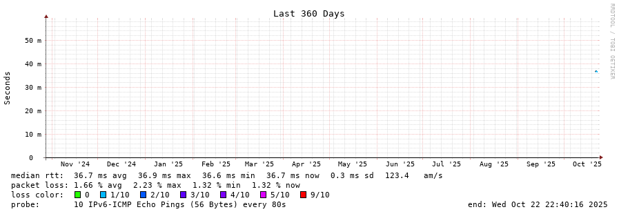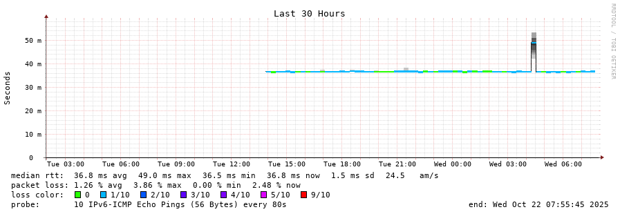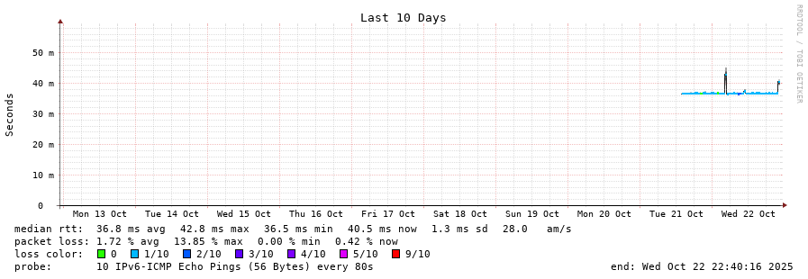 traceroute to 2001:4350:1:1::ff90 (2001:4350:1:1::ff90), 30 hops max, 80 byte packets - Generated at 2025-10-22 07:45:01