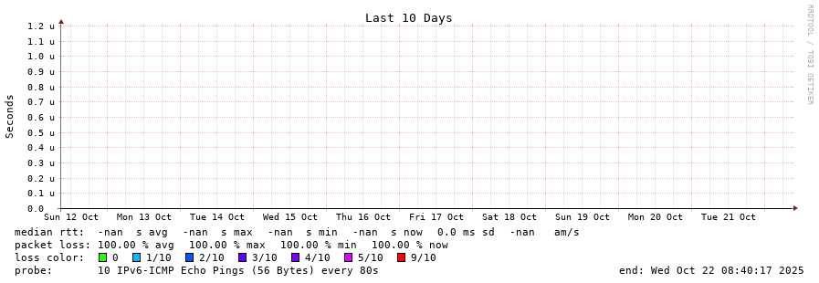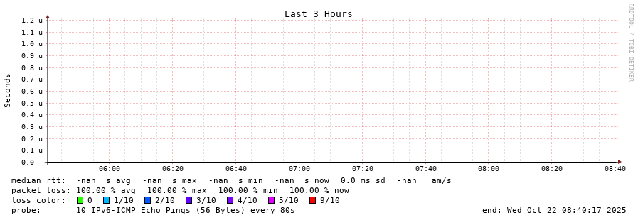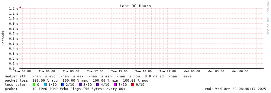 traceroute to fd69:226f:3a3c::2 (fd69:226f:3a3c::2), 30 hops max, 80 byte packets - Generated at 2025-10-21 20:30:01 3 > 4 > 5 > 6 > 7 > 8 > 9 > 10 > 11 > 12 > 13 > 14 > 15 > 16 > 17 > 18 > 19 > 20 > 21 > 22 > 23 > 24 > 25 > 26 > 27 > 28 > 29 > 30 >
